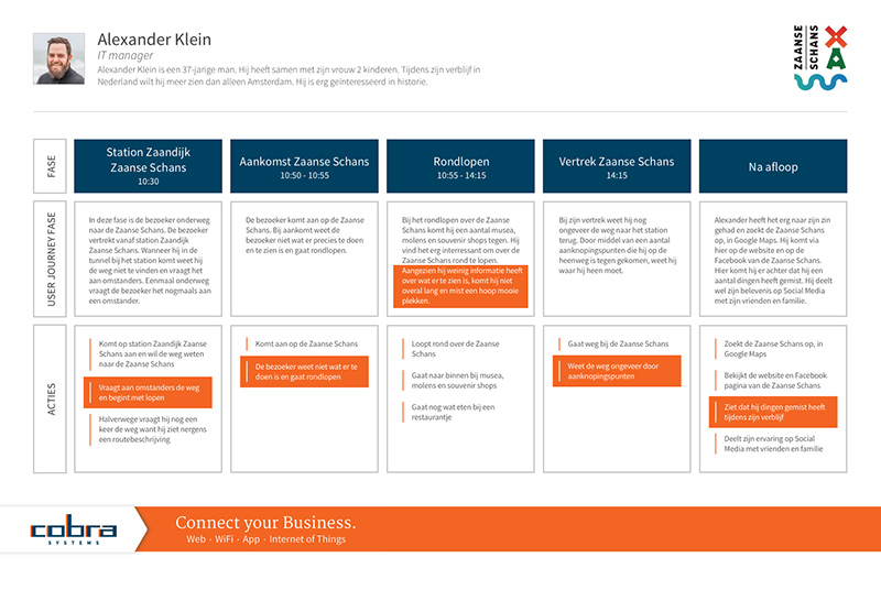 • Breng je huidige klantreis in kaart. Loop vanuit deze 5 persona’s de huidige klantreis na en zorg dat je deze visueel in kaart brengt. Spreek met de klanten en bepaal wat er in de huidige klantreis goed gaat en wat juist niet.