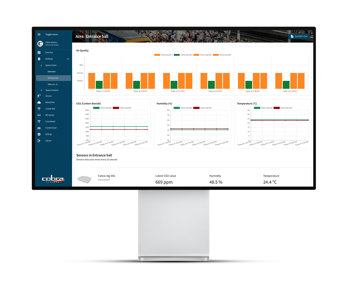 Meet de huidige situatie en zoek snelle verbeteringen. Door het meten van luchtvochtigheid, temperatuur en CO2-concentratie krijg je snel inzicht in de quick wins. Door het ontbreken van betrouwbare en betaalbare sensoren op de markt heeft Cobra Systems vanaf 2016 een eigen sensor ontwikkeld. Het doel is om jarenlang stabiel te functioneren met zo min mogelijk software updates. Het Cobra Climate Platform is door gebruik van open standaarden geschikt om gekoppeld te worden met andere hard- en software. Hiermee is sturen op en visualiseren van het (binnen)klimaat van bijvoorbeeld scholen mogelijk, ook kunnen de gegevens gecombineerd worden met andere kerngegevens, zoals bezoekerscijfers en weerdata.
